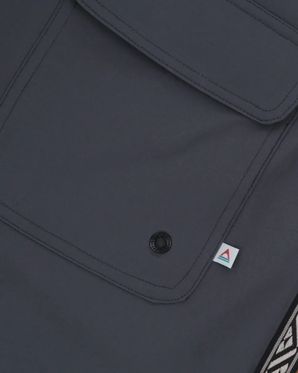 - Two tone panel short with patterned tape trim detail.