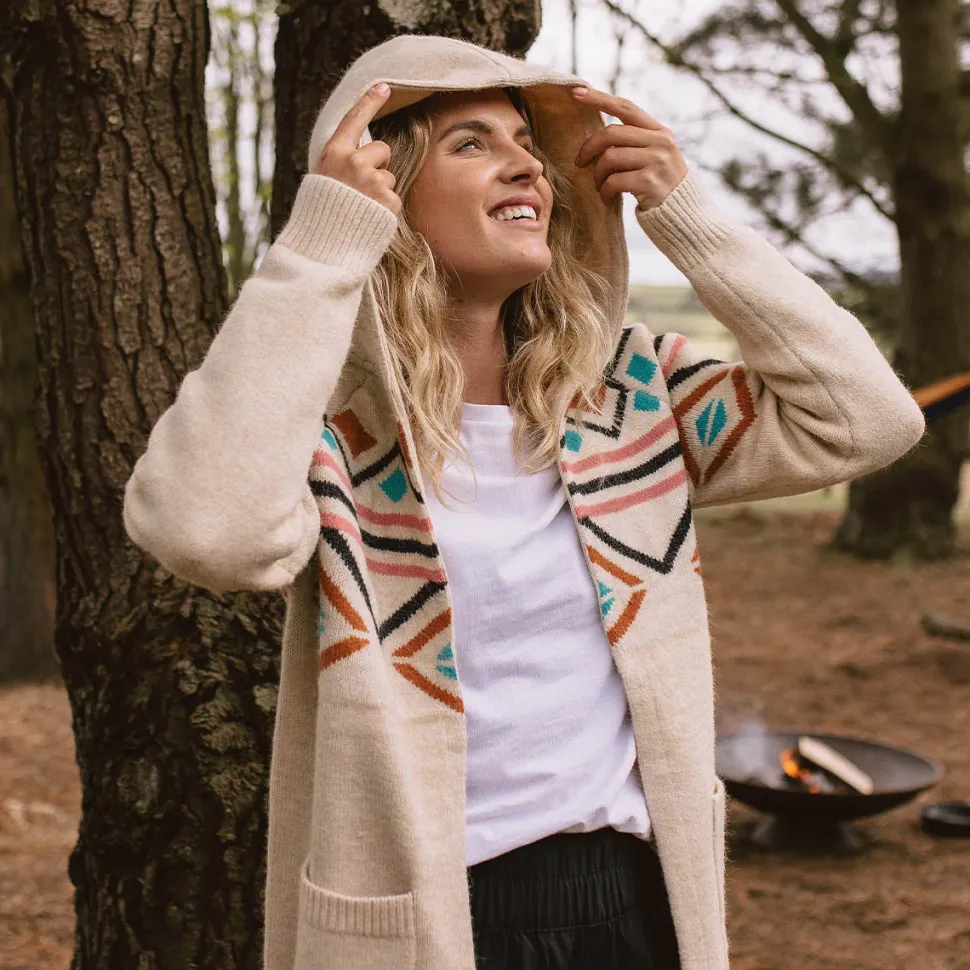 - Heavy-weight hooded cardigan with a jacquard knit pattern.
