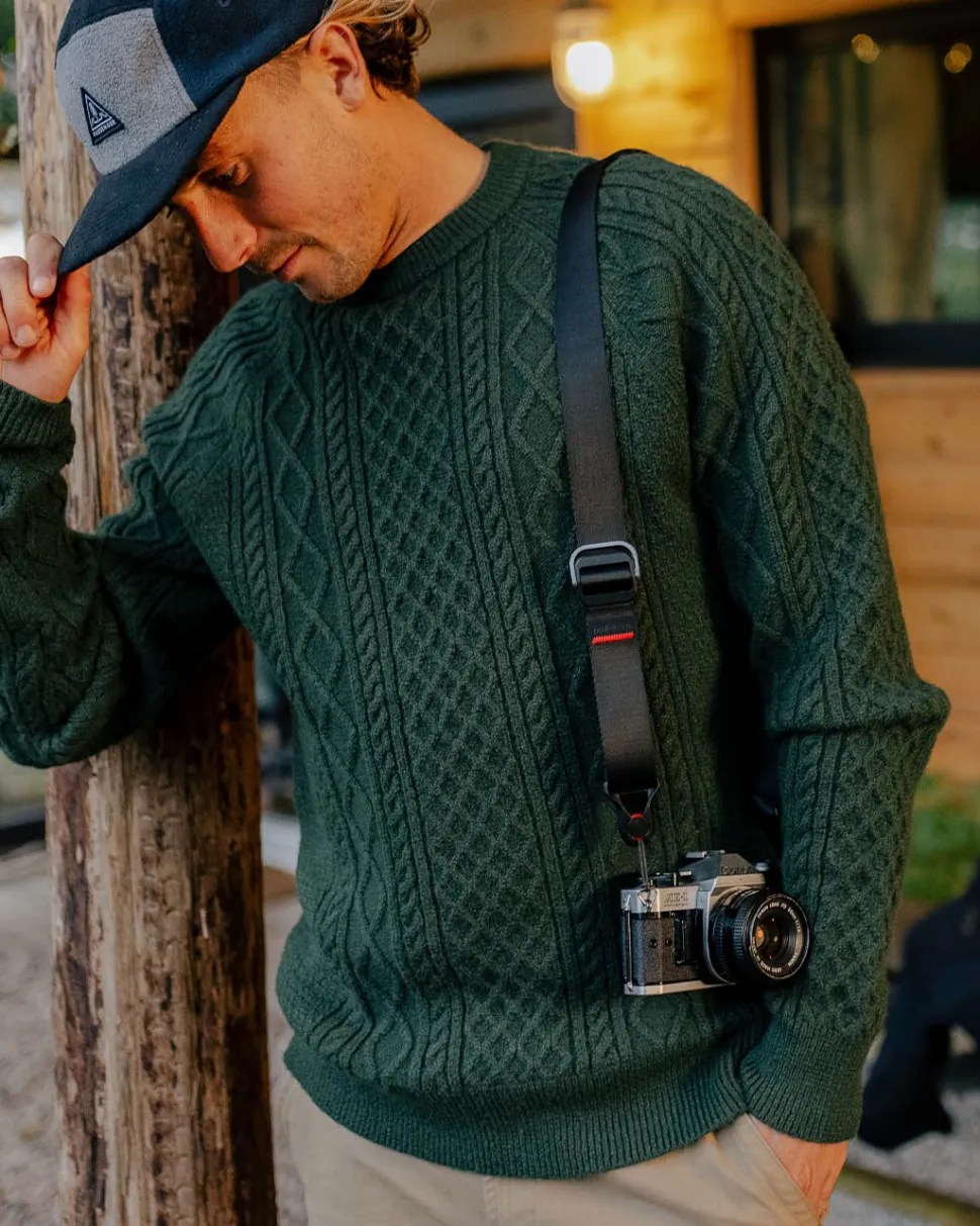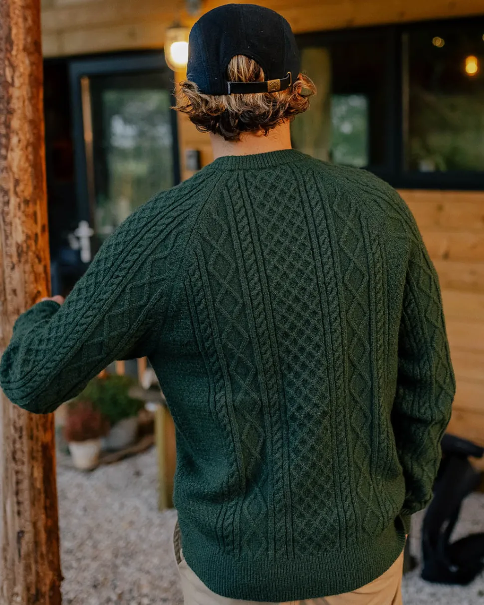 - Mid-weight cable knit with raglan sleeves.